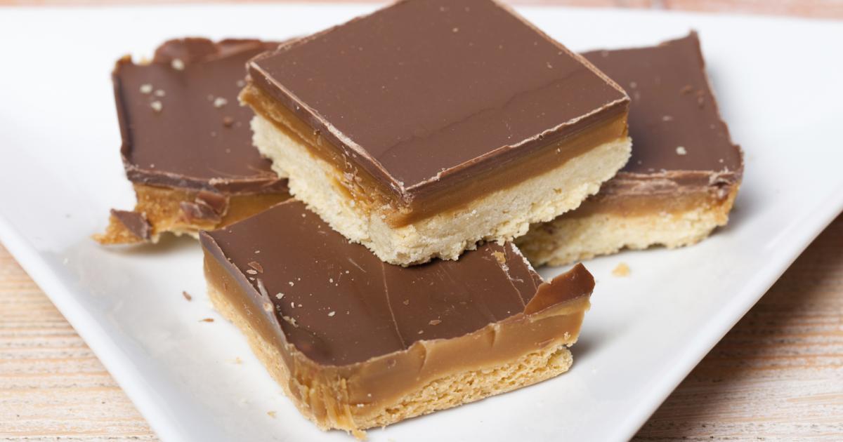 3. Pour le glaçage, faites fondre le chocolat en morceaux dans un bain-marie avec le beurre et le lait. Nappez-en le caramel. Laissez tiédir avant de placer au frais. Démoulez et coupez en petits carrés pour servir.